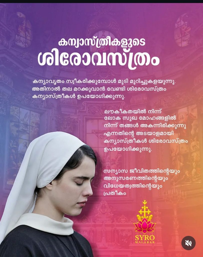 ക്രൈസ്തവ സന്യസ്തർ ഒരിക്കലും തങ്ങളുടെ സന്യാസ വസ്ത്രവും ശിരോവസ്ത്രവും ഒരു ആഭരണം പോലെയല്ല (വല്ലപ്പോഴും എടുത്തണിയുന്ന ഒന്നുപോലെ) ഉപയോഗിക്കാറുള്ളത്. അതായത് ഒരു സന്യാസിനി പ്രഭാതം മുതൽ പ്രദോഷം വരെ (അതിരാവിലെ ഉണർന്ന് ഫ്രഷ് ആയി പ്രഭാത പ്രാർത്ഥനകൾക്ക് വേണ്ടി ചാപ്പലിലേക്ക് വരുമ്പോൾ മുതൽ), തൻ്റെ സന്യാസ വസ്ത്രവും ശിരോവസ്ത്രവും ധരിച്ചാണ് അവൾ തൻ്റെ ഉത്തരവാദിത്വങ്ങൾ ഓരോന്നും നിറവേറ്റുന്നത്. അതായത് ലോകത്തിലുള്ളവർ തൻ്റെ സൗന്ദര്യം കണ്ടാലോ എന്ന് ഭയന്നല്ല, ഒരു സന്യാസിനി അവളുടെ സന്യാസ വസ്ത്രവും ശിരോവസ്ത്രവും ധരിക്കുന്നത്. മറിച്ച് അത് അവളുടെ ആത്മ സമർപ്പണത്തിൻ്റെ അടയാളമാണ്. അത് അവളുടെ ജീവനോടും ശരീരത്തോടും ഇഴുകി ചേർന്നിരിക്കുന്ന ഒന്നാണ്. അതായത് ആ വസ്ത്രം ഒരു സാക്ഷ്യമാണ്. ഒരു സന്യാസിനിയുടെ തിരുവസ്ത്രവും ശിരോവസ്ത്രവും തന്നോട് തന്നെയും സമൂഹത്തോടും പ്രഘോഷിക്കുന്നത് ദൈവത്തിനും ദൈവ ജനത്തിനുമായി താൻ സ്വയം സമർപ്പിച്ചു, ഇന്ന് മുതൽ ലോകം മുഴുവനെയും സ്വന്തമായി കാണേണ്ട ആത്മീയ മാതൃത്വത്തിന് താൻ ഉടമയായി മാറിയിരിക്കുന്നു എന്നാണ്…
