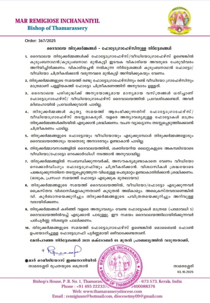 10. തിരുക്കർമ്മങ്ങളുടെ സമയത്ത് ഫോട്ടോഗ്രാഫേഴ്സ് ഉണ്ടെങ്കിൽ മൊബൈൽ ഫോൺ ഉപയോഗിച്ചുള്ള ഫോട്ടോഗ്രഫി പൂർണ്ണമായി ഒഴിവാക്കേണ്ടതാണ്.