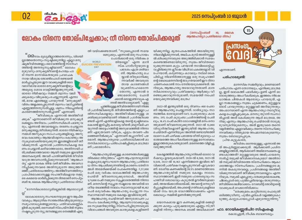 ആത്മഹത്യാ ചിന്ത പരത്തുന്ന ഇരുട്ടിനെ പ്രത്യാശയുടെ ദീപനാളം കൊളുത്തി അകറ്റാം.