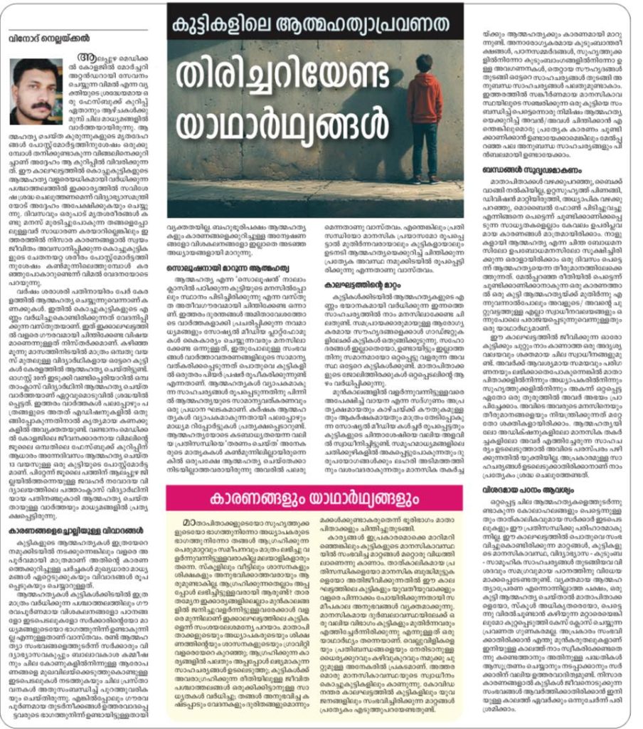 വർഷം ശരാശരി പതിനായിരം പേർ കേരളത്തിൽ ആത്മഹത്യ ചെയ്യുന്നുവെന്നാണ് കണക്കുകൾ. അതിൽ കൊച്ചുകുട്ടികളുടെ എണ്ണം വർധിച്ചുകൊണ്ടിരിക്കുന്നത് വേദനിപ്പിക്കുന്ന വസ്തുതയാണ്. ഇത് ഇക്കാലഘട്ടത്തിൽ വളരെ ഗൗരവമായി ചിന്തിക്കേണ്ട വിഷയമാണെന്നുള്ളത് നിസ്തർക്കമാണ്. കഴിഞ്ഞ മൂന്നു മാസങ്ങൾക്കിടയിൽ മാത്രം ഒമ്പതുവയസ് മുതലുള്ള, വിദ്യാർത്ഥികളായ ഒട്ടേറെ കുട്ടികൾ കേരളത്തിൽ ആത്മഹത്യ ചെയ്തിട്ടുണ്ട്. ആഗസ്റ്റ് മുപ്പതിന് ഇടുക്കി വണ്ടിപ്പെരിയാറിൽ ഒമ്പതാംക്ലാസ്സ് വിദ്യാർത്ഥിനി ആത്മഹത്യ ചെയ്ത വാർത്തയാണ് ഏറ്റവും ഒടുവിൽ ശ്രദ്ധയിൽപെട്ടത്. ഇത്തരം വാർത്തകൾ പലപ്പോഴും പത്രങ്ങളുടെ അതത് എഡീഷനുകളിൽ ഒതുങ്ങിപ്പോകുന്നതിനാൽ കൃത്യമായ കണക്കുകളിൽ അവ്യക്തതയുണ്ട്. വണ്ടാനം മെഡിക്കൽകോളേജിലെ ജീവനക്കാരനായ വിമലിന്റെ ജൂലൈ ഒമ്പതിലെ ഫേസ്ബുക്ക് കുറിപ്പിന് ആധാരം അന്നേദിവസം ആത്മഹത്യ ചെയ്ത പതിമൂന്ന് വയസുള്ള ഒരു കുട്ടിയുടെ പോസ്റ്റ്മോർട്ടമാണ്. പിറ്റേന്ന് ജൂലൈ പത്തിന് ആലപ്പുഴ ജില്ലയിൽ തന്നെയുള്ള ജവഹർ നവോദയ വിദ്യാലയത്തിലെ പത്താംക്ലാസ് വിദ്യാർത്ഥിനിയായ പതിനഞ്ചുകാരി ആത്മഹത്യ ചെയ്തതായുള്ള വാർത്തയും മാധ്യമങ്ങളിൽ പ്രത്യക്ഷപ്പെട്ടിരുന്നു.